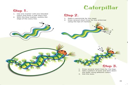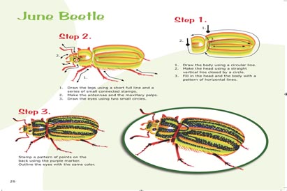 The 52-page Insects has simple step-by-step instructions beautiful color photography and illustrations to show how to draw each letter using dolphins, birds, fish, butterflies, turtles, frogs, flamingos and many more characters.