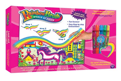 The RainbowBrush® Land & Seascapes Edition is not about phonics but about learning the alphabet in a fun and absorbing way, using exotic animals and swirling colors to create graceful, eye-catching and unique lettering from A to Z.